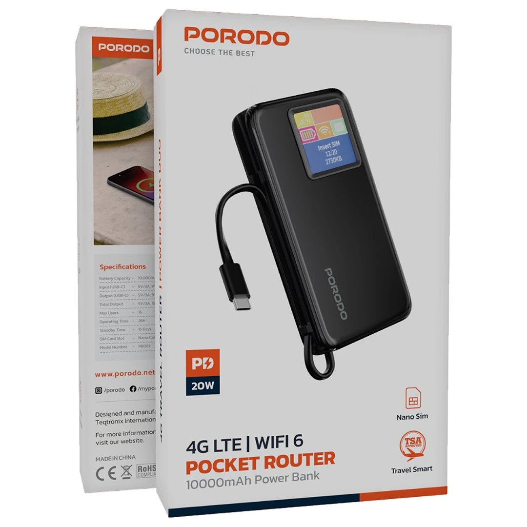 موجه السفر Porodo Duo 4G LTE WiFi 6 – 300 ميجابت في الثانية TDD-LTE، اتصال بما يصل إلى 16 جهازًا، بطارية 10000 مللي أمبير في الساعة مع وقت تشغيل 26 ساعة، بنك طاقة شحن سريع 20 واط PD.