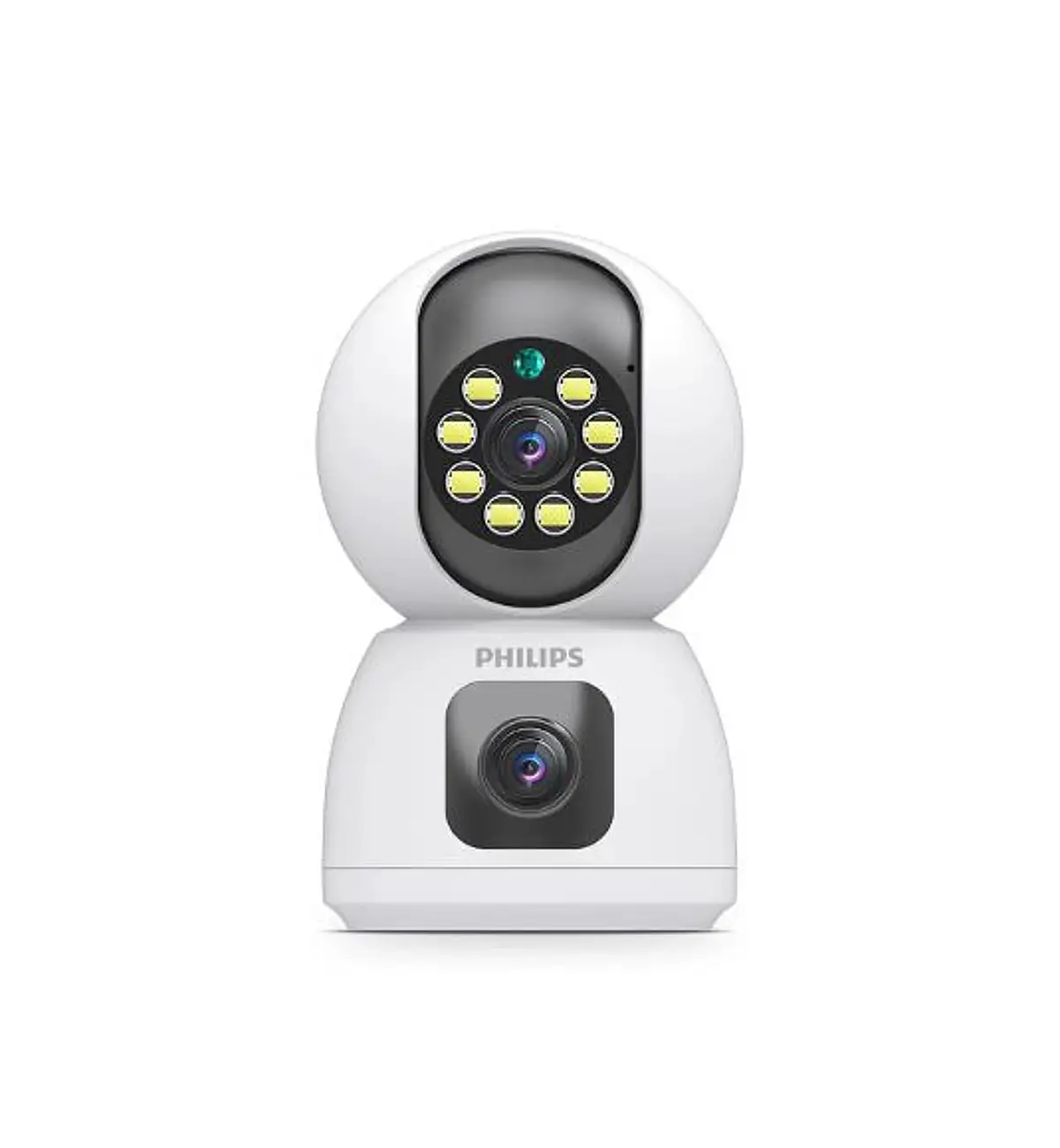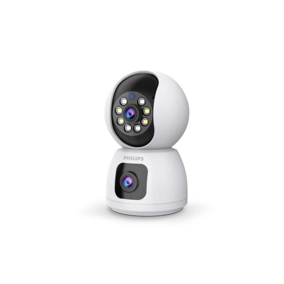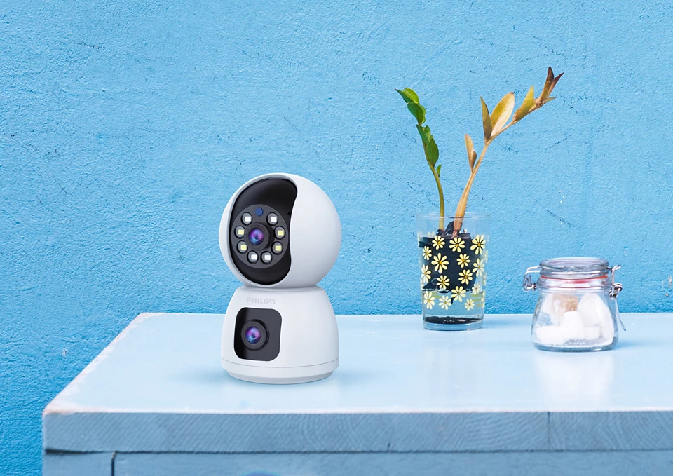 كاميرا مراقبة داخلية ذكية من فيليبس بعدستين مع دقة 1080 بكسل مع خاصية الواي فاي، تتميز بزاوية دوران 355 درجة، ورؤية ليلية، وصوت ثنائي الاتجاه.