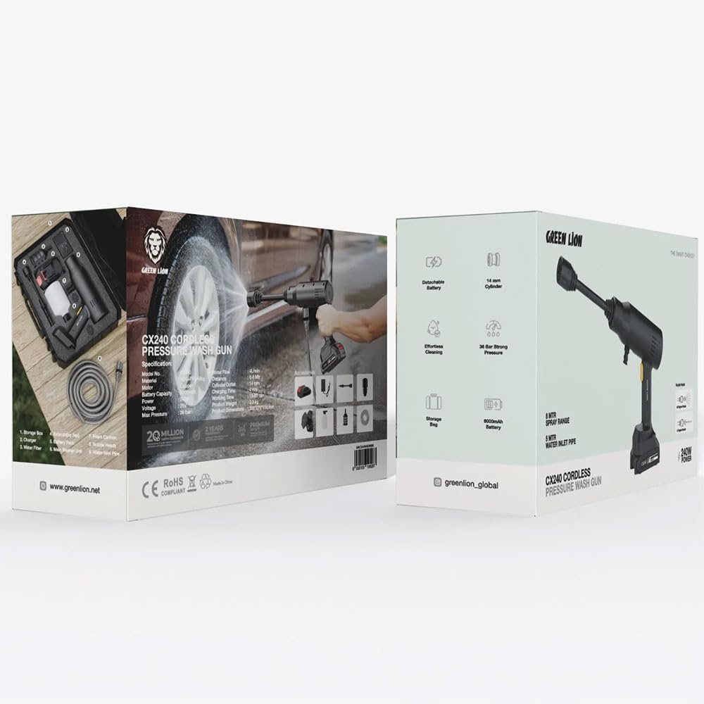 Green Lion CX240 Cordless Pressure Washer 21V/240W – 36 Bar Portable High-Pressure Car & Outdoor Cleaner with 6000mAh Detachable Battery, 8m Spray Range & 5m Water Inlet Pipe