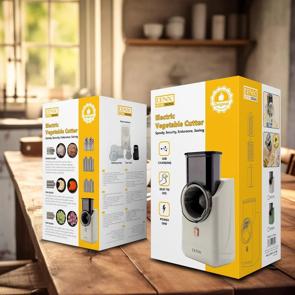 Make food preparation faster with the DENX DX2042 Electric Vegetable Cutter. Wireless design, USB charging, sharp stainless steel blades, and compact size—perfect for quick and easy kitchen use.