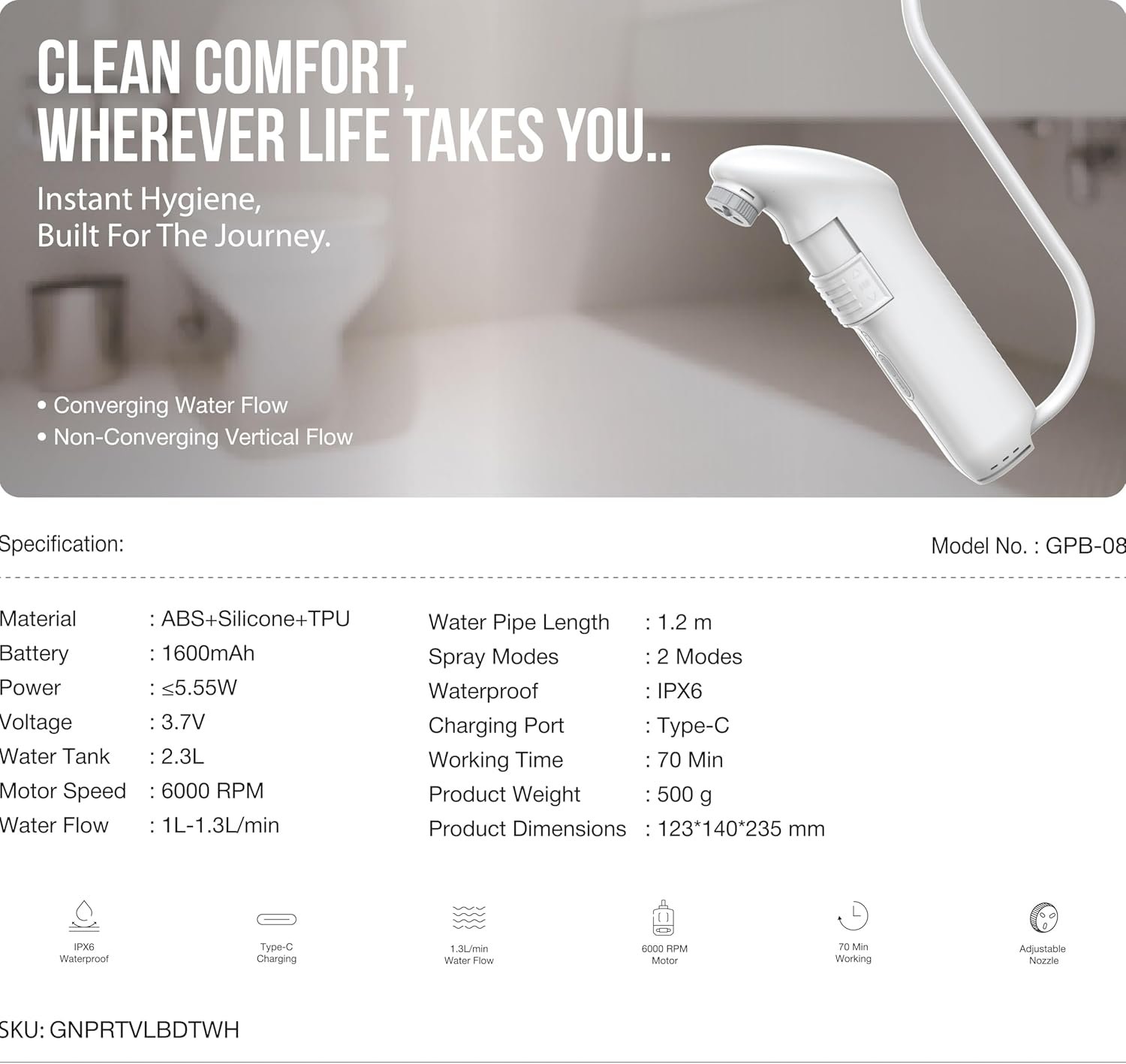Green Lion Portable Travel Bidet 2.3L – Rechargeable Personal Hygiene Sprayer with 2 Spray Modes, 6000RPM Motor, IPX6 Water Resistance & Type-C Fast Charging