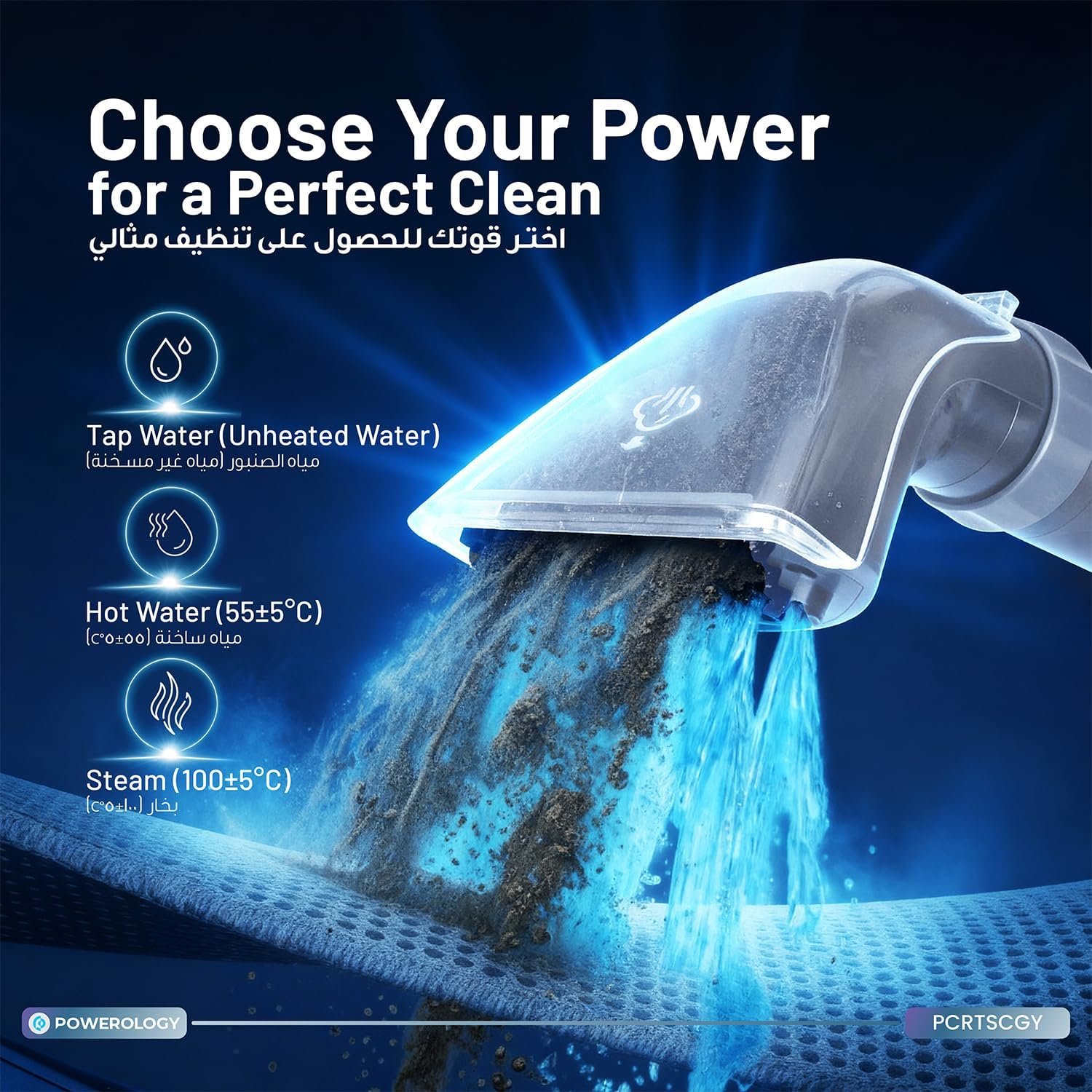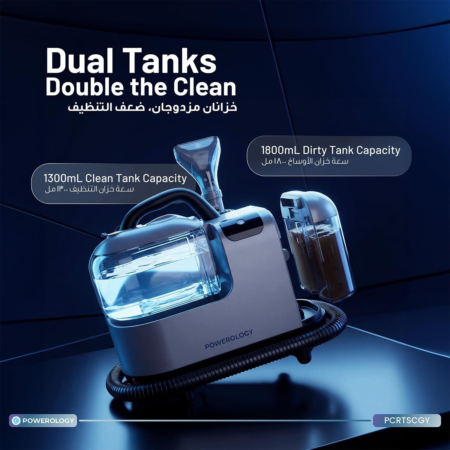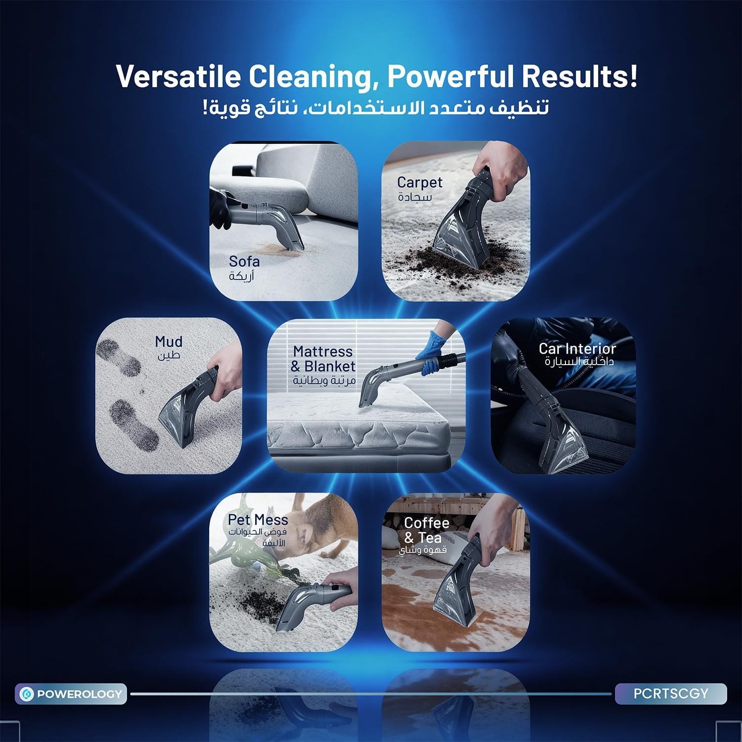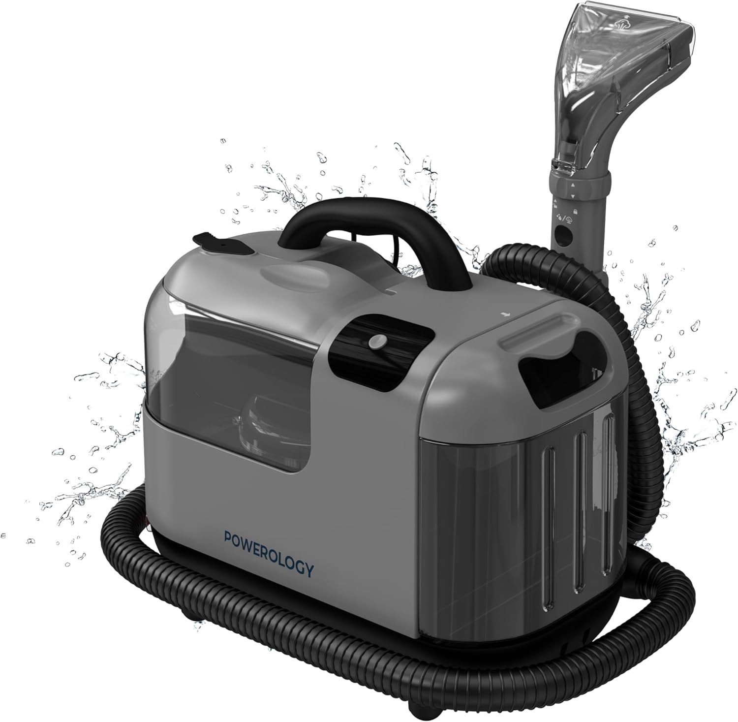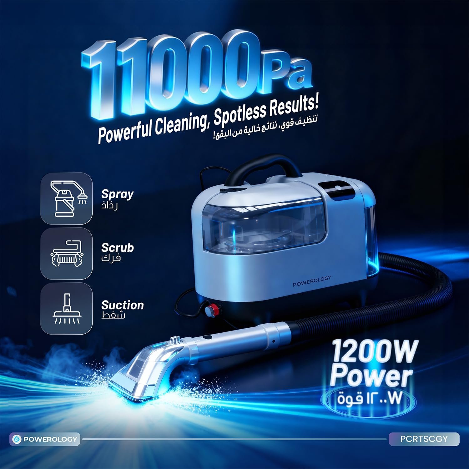 | . | • Brand: Powerology • Power: 1200W • Suction Power: 11kPa (11000Pa) • Cleaning System: Spray + Scrub + Suction • Tank System: Dual-Tank (Clean & Dirty Water) • Design: Compact & Portable • Suitable Surfaces: Carpets, Upholstery, Hard Floors, Mattresses, Sofas, Car Interiors, Kitchen & Bathroom Surfaces |